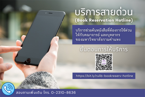 สำนักหอสมุดกลาง มหาวิทยาลัยรามคำแหง ให้บริการสายด่วน (Book Reservation Hotline) เป็นบริการช่วยค้นหนังสือที่ต้องการใช้ด่วน ให้กับคณาจารย์ และบุคลากรของมหาวิทยาลัยรามคำแหง โดยมีขั้นตอนการให้บริการ ดังนี้