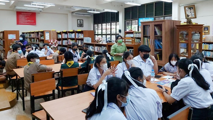 บุคลากร ฝ่ายห้องสมุดวิทยาเขตบางนา สำนักหอสมุดกลาง มหาวิทยาลัยรามคำแหง ระหว่างจัดโครงการห้องสมุดสัญจร ครั้งที่ 1 ณ โรงเรียนราชดำริ