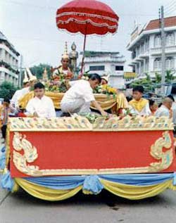 ๑. จัดเตรียมขบวนรถทรงหรือคานหามพระพุทธรูป