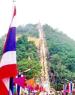 ไปด้วยสีผ้ากาสาวพัตรของพระภิกษุสงฆ์ทีทอดตัวลงมาอย่างช้า