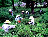 พระสงฆ์กำลังเก็บใบชาจากพุ่มชา