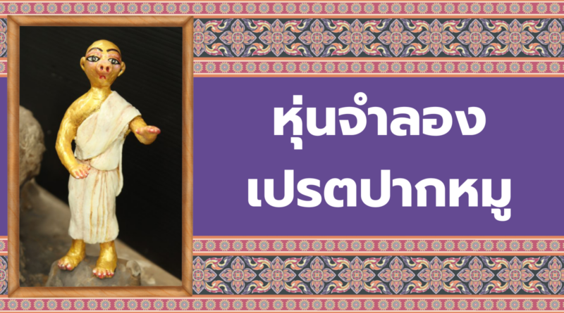 หุ่นจำลอง เปรตปากหมู การผลิตหุ่นจำลองเปรตปากหมู เพื่อเป็นสื่อส่งเสริมการศึกษาเนื้อหาวรรณคดีสุโขทัย ซึ่งเป็นพระราชนิพนธ์ใน พระมหาธรรมราชาที่ 1 ลิไทย พระมหากษัตริย์องค์ที่ 6 แห่งราชวงศ์พระร่วง (กรมศิลปากร, 2556, หน้า 75) เกี่ยวกับเปรตภูมิ เพื่อให้เข้าใจเนื้อหาวิชาการที่เป็นนามธรรมในรูปแบบรูปธรรมได้ ซึ่งทางมหาวิทยาลัยรามคำแหง มีการเรียนการสอนในกระบวนวิชาวรรณคดีสุโขทัย (THA