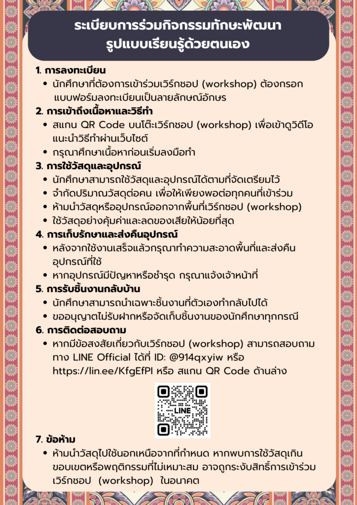 - หากมีข้อสงสัยเกี่ยวกับเวิร์กชอป (workshop) สามารถสอบถามทาง LINE Official ได้ที่ ID: @914qxyiw หรือ https://lin.ee/KfgEfPI