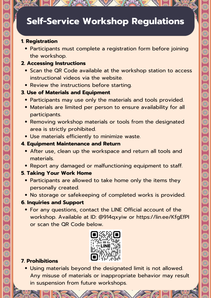 - จำกัดปริมาณวัสดุต่อคน เพื่อให้เพียงพอต่อทุกคนที่เข้าร่วมห้ามนำวัสดุหรืออุปกรณ์ออกจากพื้นที่เวิร์กชอป (workshop)
