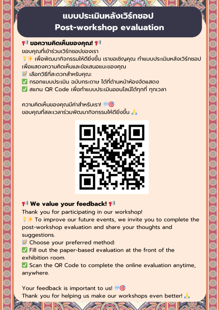 - สแกน QR Code บนโต๊ะเวิร์กชอป (workshop) เพื่อเข้าดูวิดีโอแนะนำวิธีทำผ่านเว็บไซต์