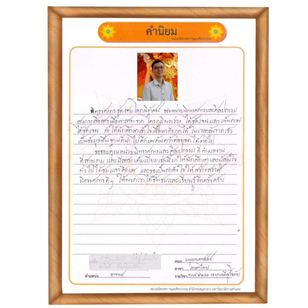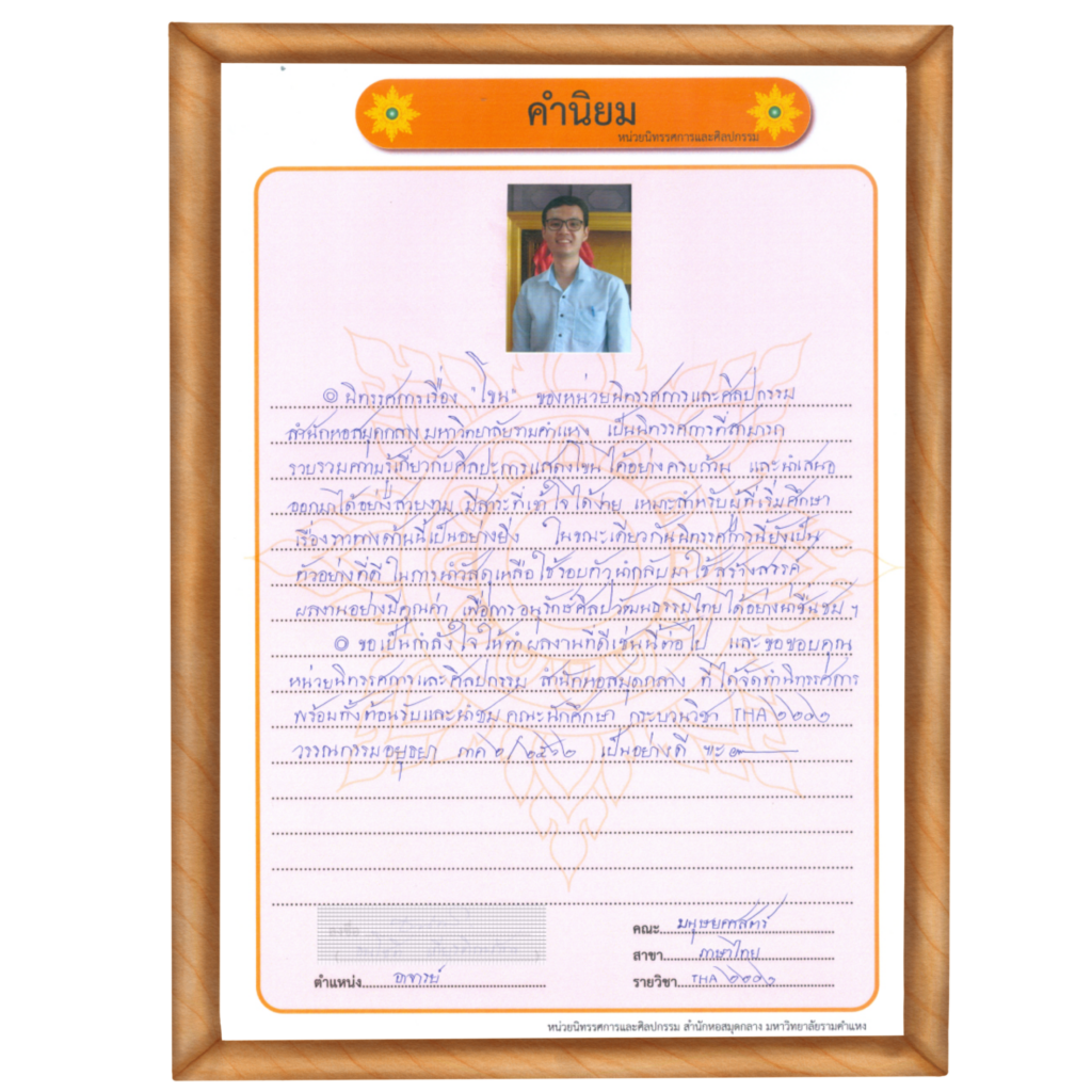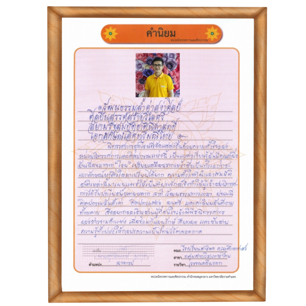 คำนิยม จาก อาจารย์ ดร.ธรรมจักร พรหมพ้วย รองคณบดีฝ่ายบริหาร (2563) ภาควิชาศิลปะการแสดงไทย คณะศิลปกรรมศาสตร์ มหาวิทยาลัยรามคำแหง
