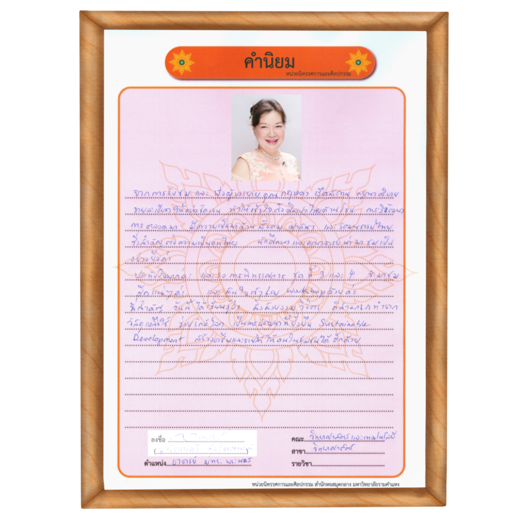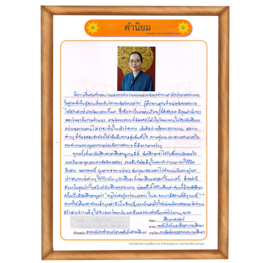“มีความชื่นชมกับผลงานและการทำงานของหน่วยนิทรรศการและศิลปกรรมอย่างมาก ในฐานะที่เป็นผู้สอนเกี่ยวกับวิชาการจัดนิทรรศการ รู้สึกขอบคุณที่หน่วยนิทรรศการฯ ได้สร้างสรรค์ห้องนิทรรศการขึ้นมา ซึ่งถือว่าเป็นแหล่งเรียนรู้ที่สำคัญและมีคุณค่ายิ่งของมหาวิทยาลัยรามคำแหง งานนิทรรศการที่จัดแสดงได้เป็นวิทยาทานให้กับนักศึกษาอย่างหลากหลายไม่ว่าจะเป็นในเชิงวิชาการ เชิงศิลปะหรือการออกแบบ ผลงานต่าง ๆ ที่จัดแสดงสะท้อนให้เห็นถึงความมุ่งมั่นตั้งใจ ความทุ่มเท และความสามารถในการทำงานของบุคลากรหน่วยนิทรรศการฯ ที่มีมากมายจริง ๆ ทุกครั้งที่พานักศึกษามาศึกษาดูงานที่นี่ นักศึกษาจะได้รับทั้งแรงบันดาลใจ แนวคิดและมุมมองขิงการจัดนิทรรศการ รวมถึงข้อคิดดี ๆ ในการทำงานและการใช้ชีวิตอีกด้วย นอกจากนี้บุคลากรของหน่วยฯ ยังกรุณาสละเวลาไปช่วยแบ่งปันความรู้และประสบการณ์ต่าง ๆ ให้กับน้อง ๆ นักศึกษาที่คณะศึกษาศาสตร์ในบางครั้ง สิ่งเหล่านี้ล้วนเป็นคุณประโยชน์แก่นักศึกษาอย่างมาก บ่อยครั้งที่ได้รับเสียงสะท้อนที่ดีจากนักศึกษา ครั้งหนึ่งมีนักศึกษาพูดว่า “หนูไม่เคยรู้มาก่อนเลยว่า ใน ม. ของเรามีสถานที่ดี ๆ แบบนี้” อยากให้เสียงสะท้อนเล็ก ๆ เหล่านี้เป็นอีกหนึ่งแรงบันดาลใจให้หน่วยนิทรรศการและศิลปกรรมสร้างสรรค์งานดี ๆ ให้กับมหาวิทยาลัยและสังคมอย่างต่อเนื่องต่อไปนาน ๆ นะคะ”