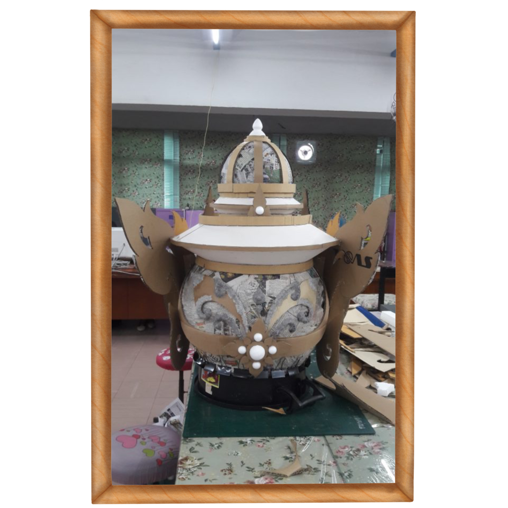 ซึ่งหุ่นจำลองครุฑชิ้นนี้ ผลิตขึ้นมาด้วยวัสดุเหลือใช้ในอัตราร้อยละ 85 เพื่อเป็นการลดปริมาณขยะ อนุรักษ์สิ่งแวดล้อม และสามารถประหยัดงบประมาณได้ ด้วยวิธี Upcycle ดำเนินการออกแบบหุ่นจำลองโดยนายกฤษดา เรืองสถาน นักวิชาการโสตทัศนศึกษา ชำนาญการ ซึ่งนำศิลปะไทยเป็นแนวทางหลักในการออกแบบ เนื่องจากเป็นวรรณคดีไทย โดยมีการปรับประยุกต์รูปแบบการ์ตูนเข้าไปในชิ้นงานด้วย เพื่อให้เกิดการเข้าถึงและเข้าใจที่ง่ายมากยิ่งขึ้นได้ในกลุ่มผู้เรียน ซึ่งจากสถิติการเข้าใช้บริการกลุ่มผู้เรียนมีช่วงอายุอยู่ระหว่าง 18 – 25 ปี โดยประมาณ อีกทั้งเพื่อให้ดูน่าสนใจดึงดูดการอยากเรียนรู้ที่มากขึ้น ตามที่แสดงในภาพข้างต้น