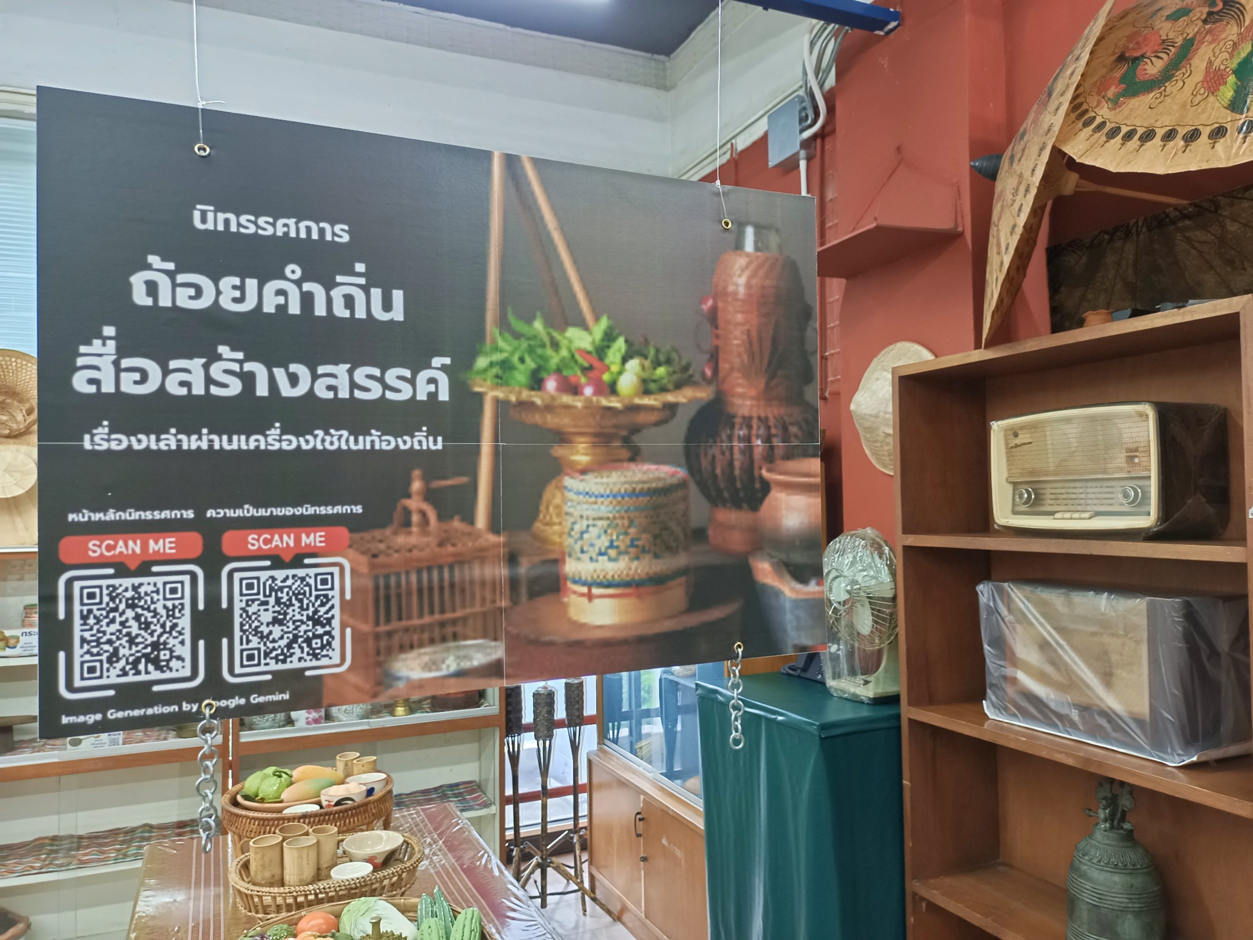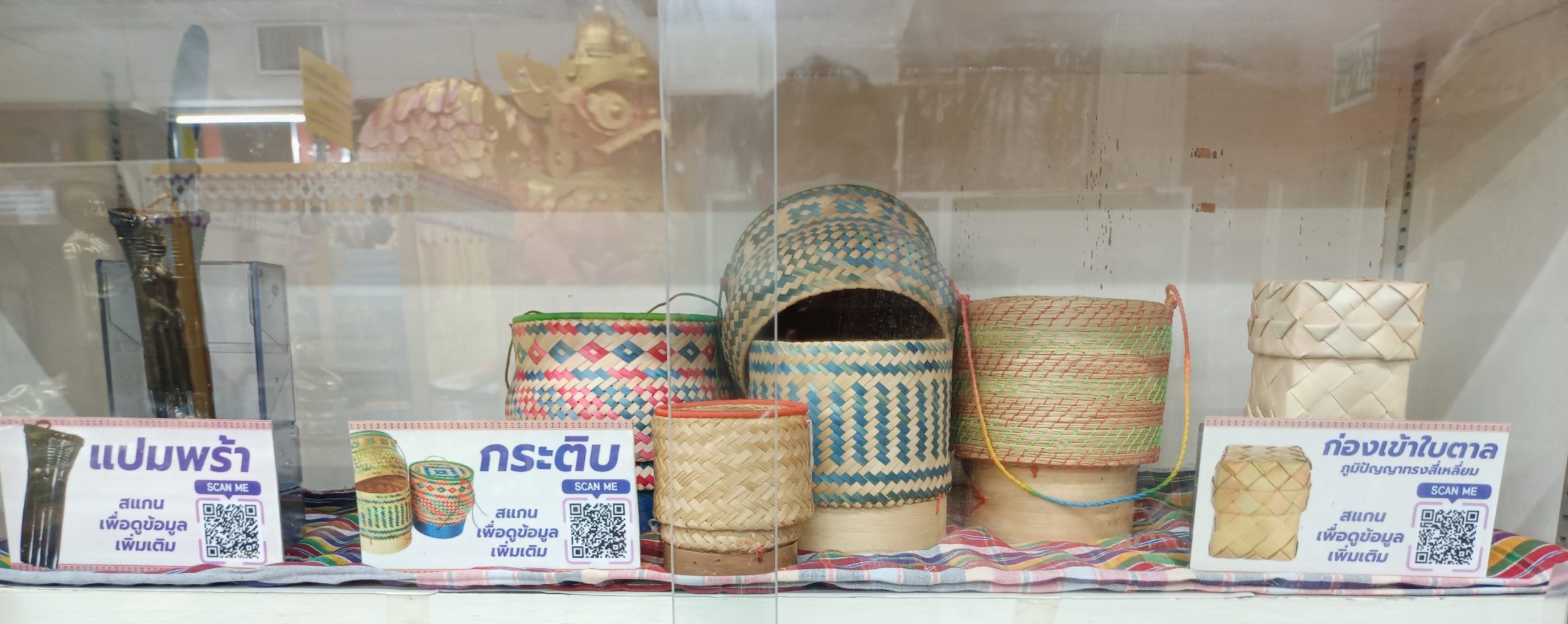 จัดแสดงเครื่องใช้พื้นบ้านของจริง เช่น กระติบ, กระต่ายขูดมะพร้าว, ปลาตะเพียนสาน เป็นต้น ให้ผู้ชมได้สัมผัสภูมิปัญญาดั้งเดิมอย่างใกล้ชิด ณ ห้องจัดแสดงนิทรรศการ ชัน 4 อาคาร 3 สำนักหอสมุดกลาง (หัวหมาก) มหาวิทยาลัยรามคำแหง เปิดให้เข้าชมในวันและเวลาราชการ