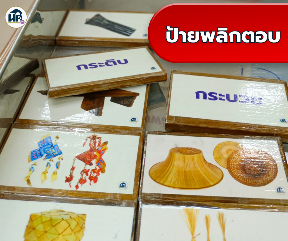 “ป้ายพลิกตอบ” เปลี่ยนป้ายข้อมูลแบบเดิม ๆ ที่แค่อ่าน ให้กลายเป็นกิจกรรมที่ผู้เข้าชมต้องลงมือทำ เพื่อค้นพบคำตอบ ทำให้การเรียนรู้ไม่น่าเบื่อและจดจำได้ง่ายขึ้น ใช้ป้ายไม้ให้สามารถพลิกเปิด เพื่อสร้างความรู้สึกของการค้นพบ โดยมีป้ายคำถามตัวใหญ่ ๆ กำกับว่า “บ้านเราเรียกว่าอะไร” เมื่อพลิกป้ายขึ้นมา จะพบกับ “คลังคำ” นี่คือการเรียนรู้ “คำถิ่น” ที่ใช้เรียกเครื่องใช้แต่ละชิ้น