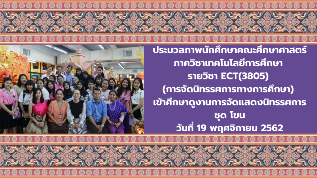 ประมวลภาพนักศึกษาคณะศึกษาศาสตร์ ภาควิชาเทคโนโลยีการศึกษา รายวิชา ECT(3805) (การจัดนิทรรศการทางการศึกษา) เข้าศึกษาดูงานการจัดแสดงนิทรรศการชุด โขน (19 พฤศจิกายน พ.ศ. 2562)