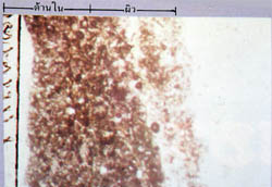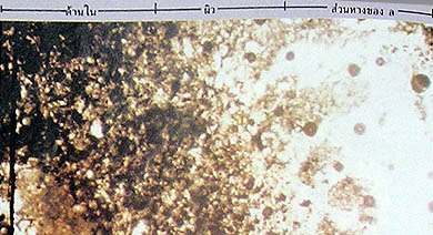 ต่อจากนั้นได้ทำการวิเคราะห์ ปริมาณแร่ธาตุบนตัวอย่าง ทั้งส่วนที่อยู่ที่ผิวและส่วนที่อยู่ด้านใน ด้วยเครื่องมือ Energy Dispersive X-ray Fluorescence Spectrometer ซึ่งเป็นเครื่องมือที่อาศัยหลักว่า เมื่อยิงลำแสงอิเล็กตรอนจากกล้องจุลทรรศน์อิเล็กตรอนไปยังผิวของตัวอย่าง ลำแสงของอิเล็กตรอนจะทำให้เกิดรังสีเอกซ์ (X-ray) ที่มีพลังงานต่างๆ ขึ้นอยู่กับชนิดของธาตุที่เป็นองค์ประกอบเมื่อวัดพลังงานของรังสีเอกซ์ที่เกิดขึ้น จะสามารถคำนวณหาปริมาณแร่ธาตุที่เป็นองค์ประกอบบนจุดเล็กๆ แต่ละจุดบนตัวอย่างได้ เมื่อเปรียบเทียบผลการวิเคราะห์หลายๆ จุด บนตัวอย่างแต่ละตัวอย่างแล้วหาค่าเฉลี่ย พบว่าความแตกต่างขององค์ประกอบที่ผิวกับส่วนที่อยู่ข้างใน ของศิลาจารึกหลักที่ ๑ หลักที่ ๓ หลักที่ ๔๕ และหลักที่กล่าวถึงชีผ้าขาวเพสสันดร มีสัดส่วนใกล้เคียงกัน เช่น มีปริมาณ แคลเซี่ยม และแคลเซี่ยมออกไซด์ (ซึ่งเป็นองค์ประกอบสำคัญของแร่แคลไซต์) ลดลงร้อยละ ๓-๑๐ ปริมาณอลูมิเนียม และอลูมิเนียมออกไซด์ (ซึ่งเป็นองค์ประกอบสำคัญของแร่เฟลด์สปาร์ และแร่คลอไรต์) ลดลงร้อยละ ๒-๑๐ เป็นต้น การที่แร่ธาตุบางอย่างบนผิวของศิลาจารึก มีปริมาณแตกต่างจากเนื้อหินด้านใน ก็เพราะกระบวนการสึกกร่อนผุพังของหินเนื่องจากการกระทำของสิ่งแวดล้อมนั่นเอง แร่เฟลด์สปาร์ ไม่ทนทานต่อการสึกกร่อนผุสลาย จึงมักละลายหรือสลายไปเป็นดิน แร่แคลไซต์ ละลายได้ดีในน้ำที่มีฤทธิ์เป็นกรดอ่อนๆ เช่น น้ำฝน น้ำใต้ดิน ฯลฯ ผิวของ ศิลาจารึกจึงมีแร่เหล่านี้ลดลง ส่วนแร่ควอร์ตซ์ ทนทานต่อการกระทำของสภาวะแวดล้อมได้ดี ปริมาณจึงไม่ลดลง การเปลี่ยนแปลงดังกล่าวเป็นการเปลี่ยนแปลงที่เกิดขึ้นอย่างช้าๆ ค่อยเป็นค่อยไป เป็นกระบวนการที่ต้องอาศัยเวลา ไม่สามารถเร่งให้เกิดขึ้นในระยะเวลาสั้นๆ หรือทำเทียมเลียนแบบได้เหมือน |
