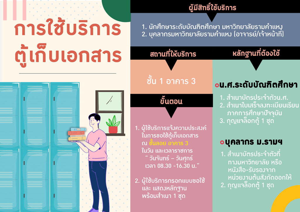 การใช้บริการตู้เก็บเอกสาร สำนักหอสมุดกลาง สำหรับนักศึกษาระดับบัณฑิตศึกษา และบุคลากรมหาวิทยาลัยรามคำแหง