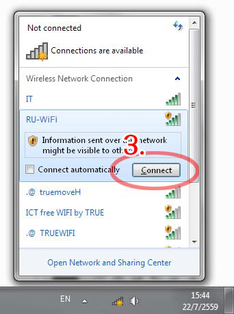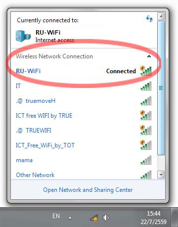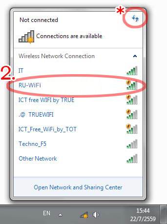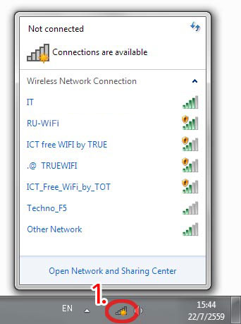 1. เปิดการใช้งาน Wireless Network Connection และคลิกที่ Icon ของ Wireless Network Connection บน Taskbar