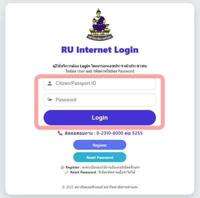 ใช้ "User name" เป็นรหัสบัตรประจำตัวประชาชน และ "Password" ที่สร้างขึ้นมาเพื่อใช้งาน "อินเทอร์เน็ตมหาวิทยาลัยรามคำแหง (RU Internet Access Authentication)" สำหรับผู้ที่ยังไม่ได้ลงทะเบียนเพื่อใช้งาน สามารถลงทะเบียนได้ที่ http://beta-e-service.ru.ac.th:90